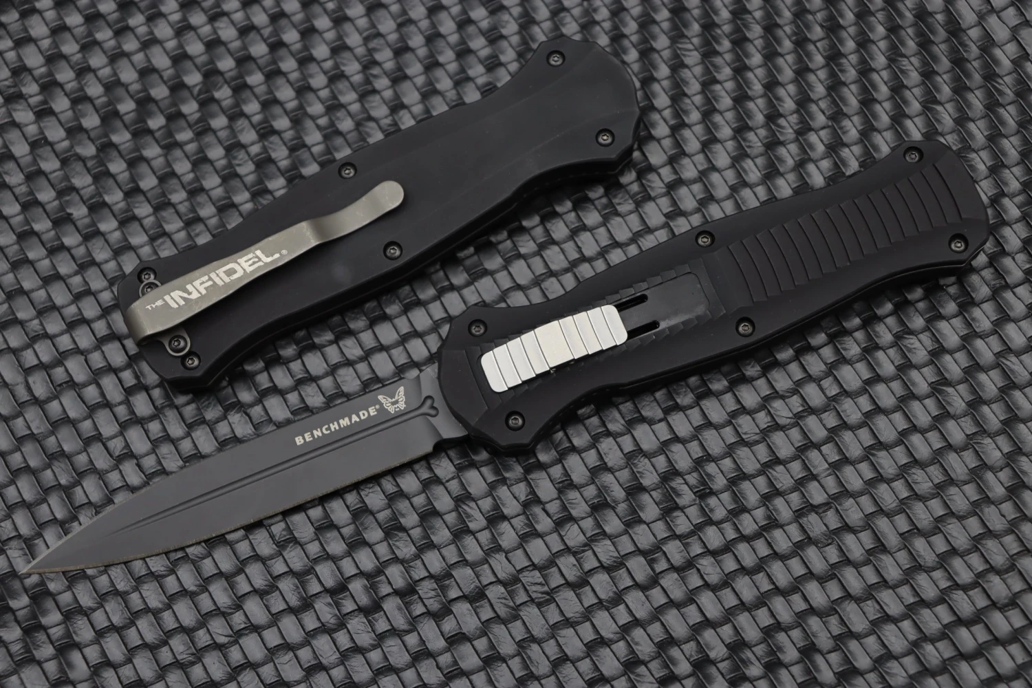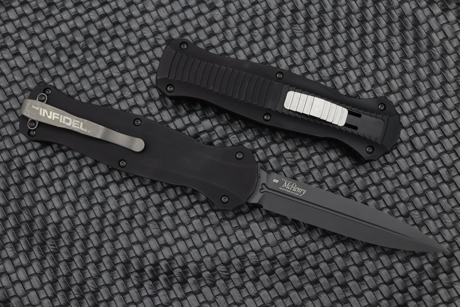 In addition to the incredibly stable, fast action and the rugged, pure tactical nature of the knife, the Infidel 3300BK has a cool factor that is hard to describe without physically experiencing it. Customize the McHenry & Williams designed automatic-opening out-the-front double-edge dagger. MOLLE® compatible. Made in USA.