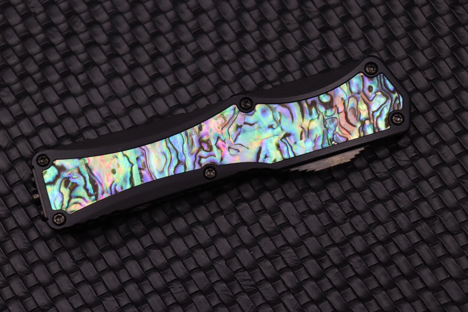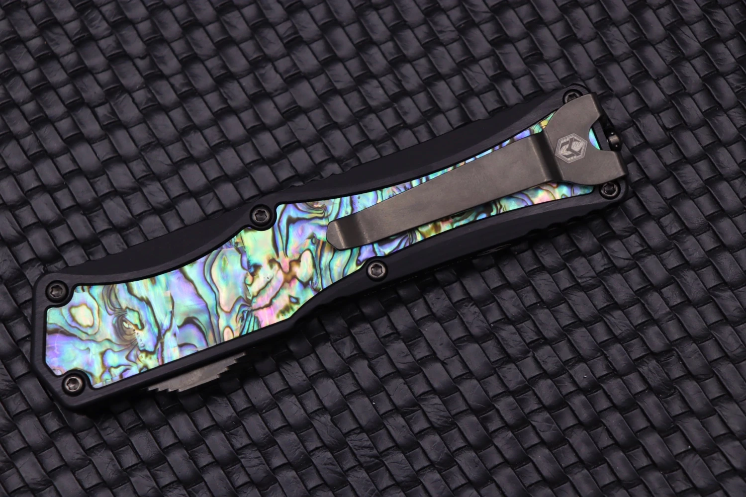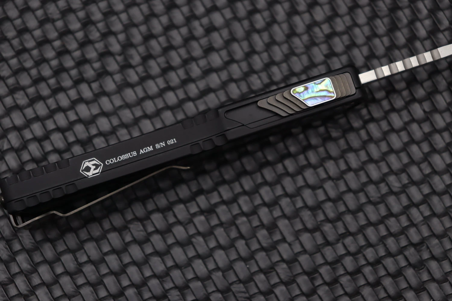 This beautiful Colossus model features a black ano handle with Abalone Inlays on the handle and button. As well as a hand ground Cracked Ice Mirror Polish Tanto Blade.