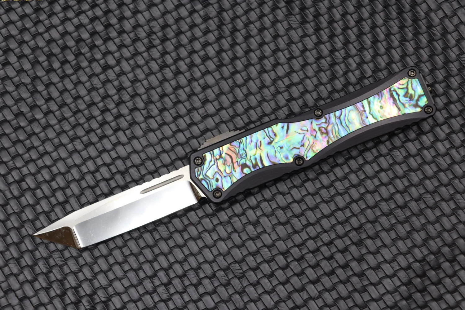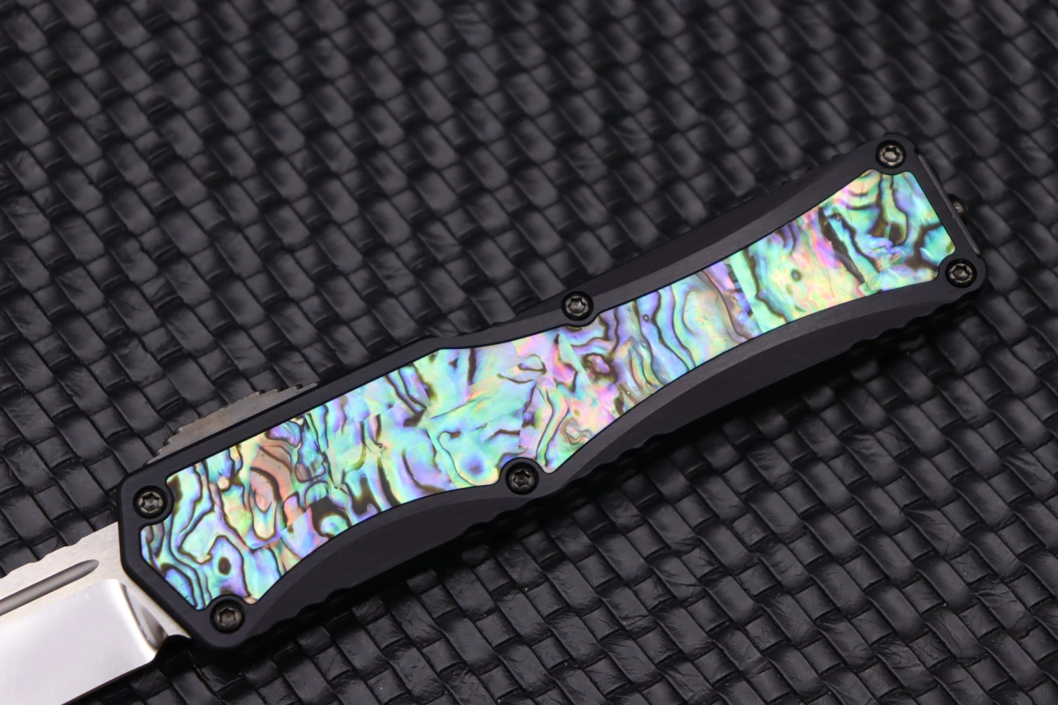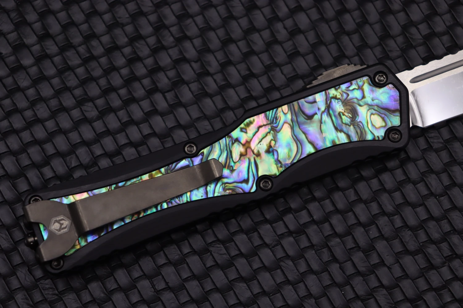 This beautiful Colossus model features a black ano handle with Abalone Inlays on the handle and button. As well as a hand ground Cracked Ice Mirror Polish Tanto Blade.