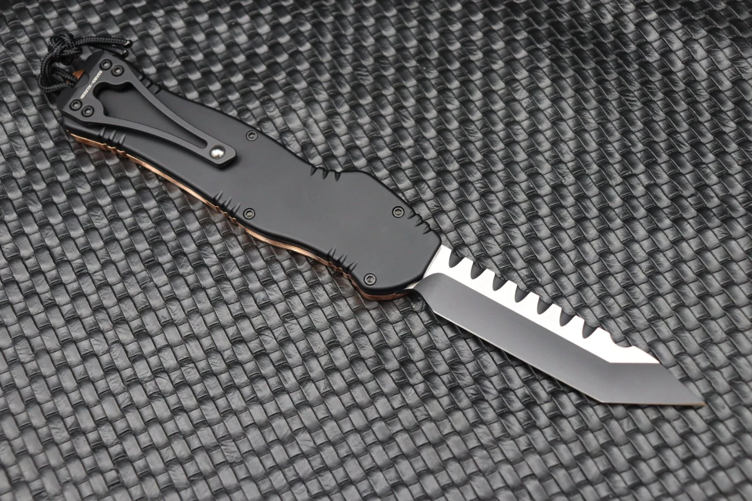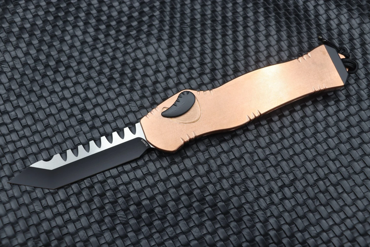 This single action OTF features a black two tone tanto S35 blade and a full copper body.