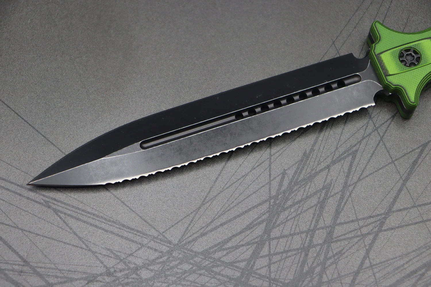 This double edge dagger fixed blade was made from one solid piece of Elmax steel. It features carbon fiber handles with battleworn hardware and a battleworn finish on the blade. It comes with a black nylon sheath. Made in USA.