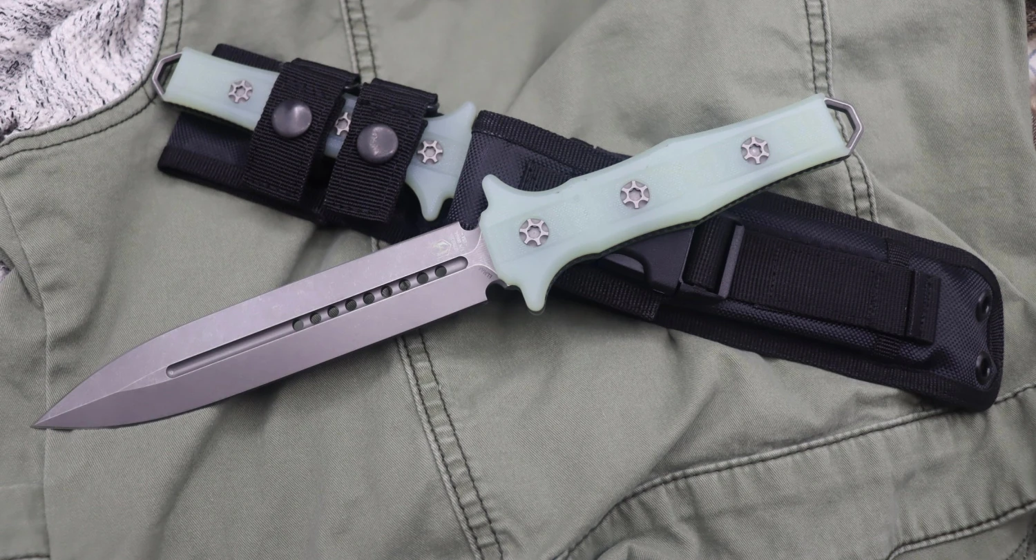 This double edge dagger fixed blade was made from one solid piece of Elmax steel. It features Jade G-10 handles and a Battleworn finish on the blade. It comes with a black nylon sheath. Made in USA.