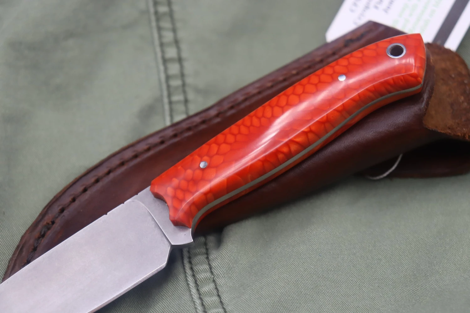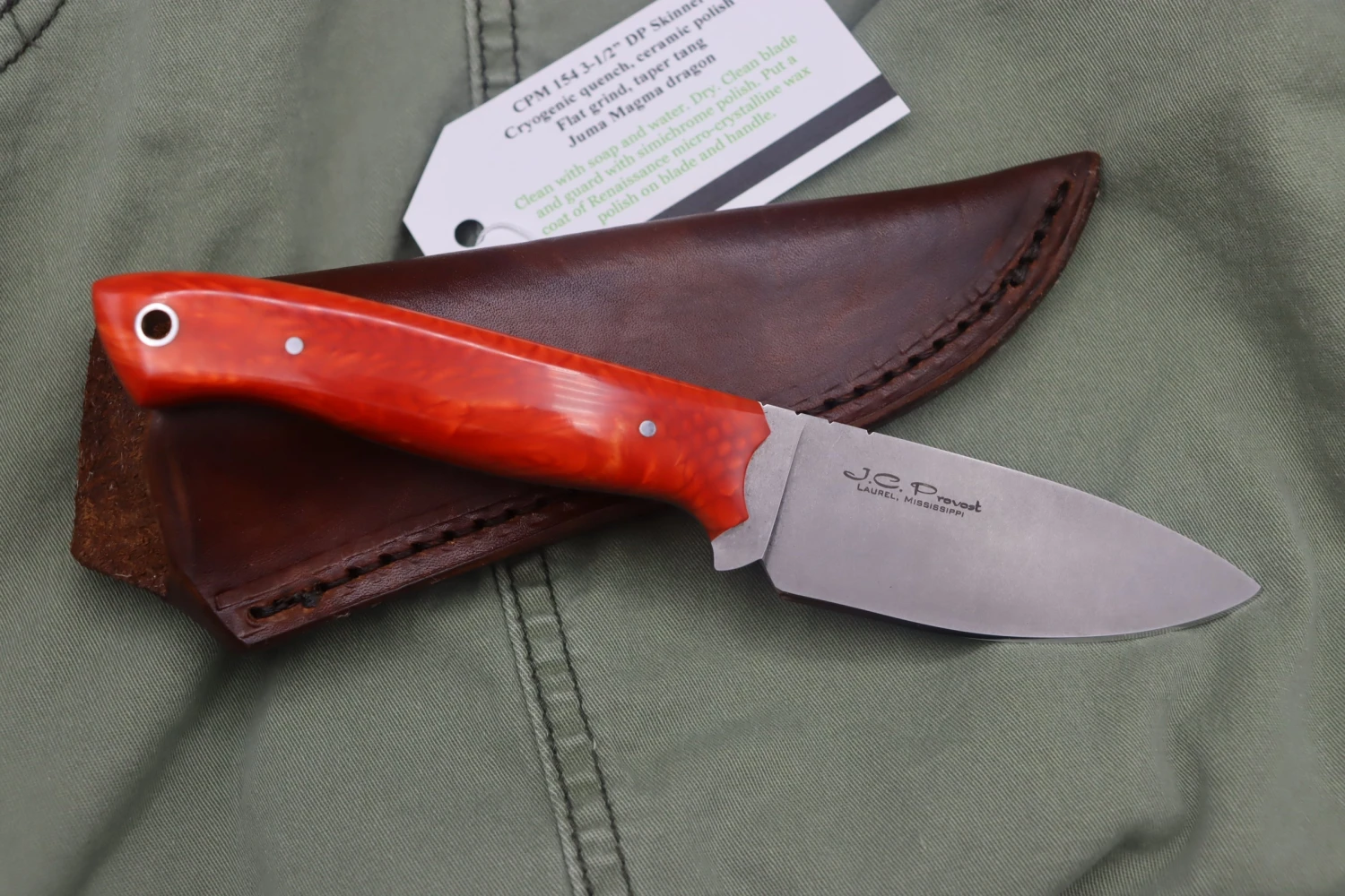 This is a J.C Provost custom made knife that features a CPM-154CM blade with Juma Magma scales. It comes with a leather sheath and outer box. Made in Mississippi, USA.