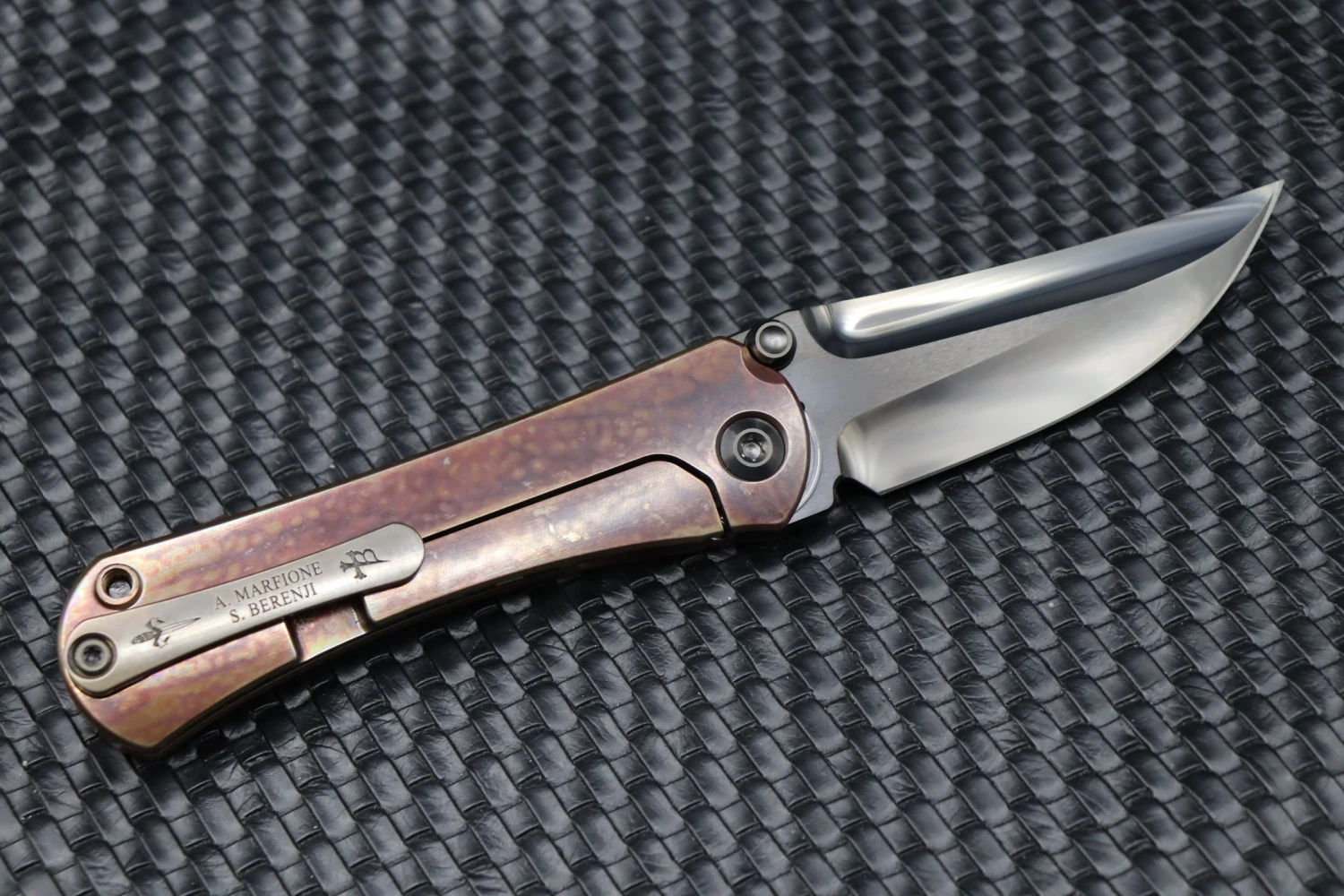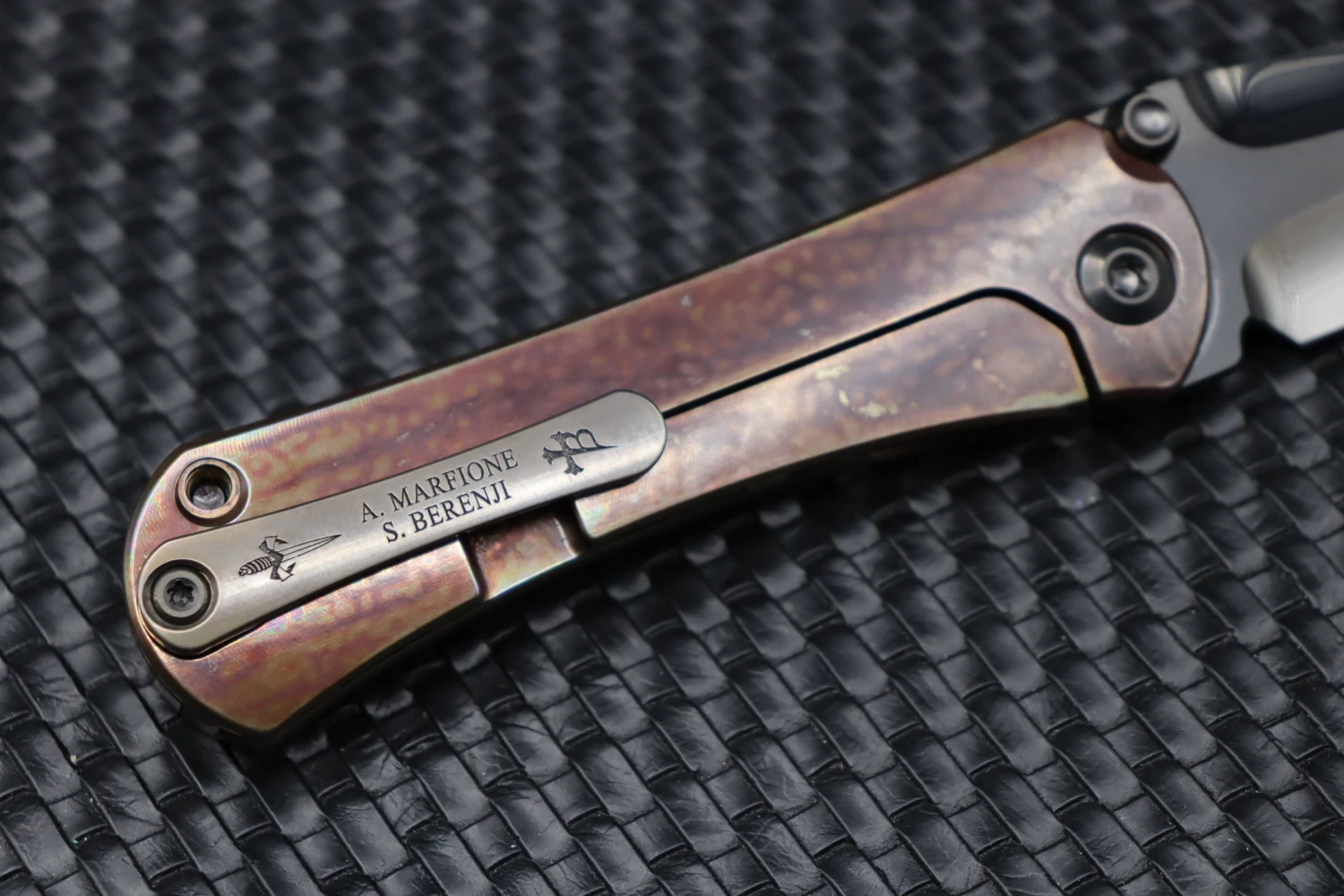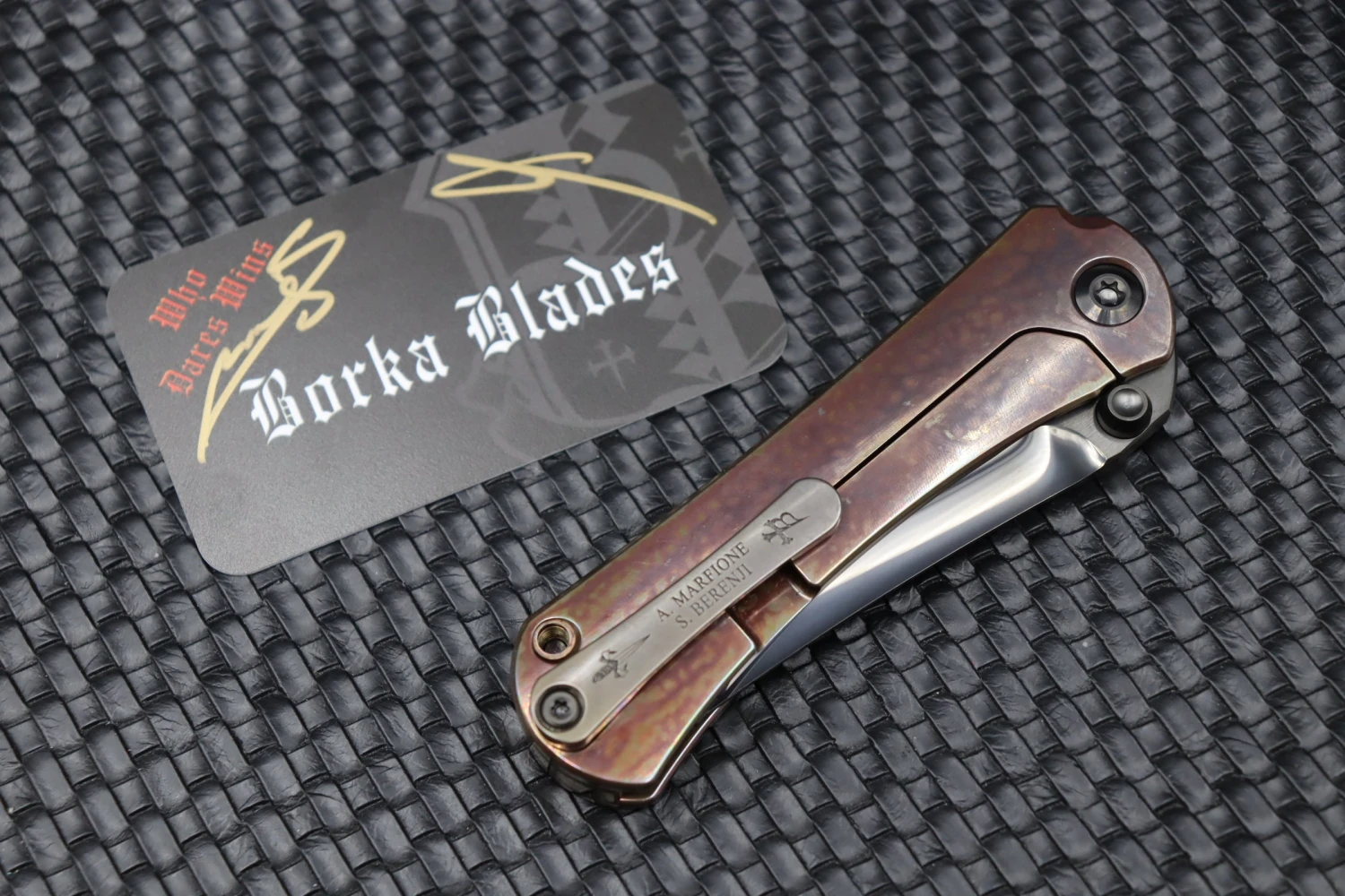 This is a beautiful SBKFÂ featuring a hand ground diamond polished Assassin grind blade with bloodwash finished scales and a matching backspacer. Included is a COA, and a plush pouch with Marfione Dagger and Borka Blades Zipper Pull.Â
