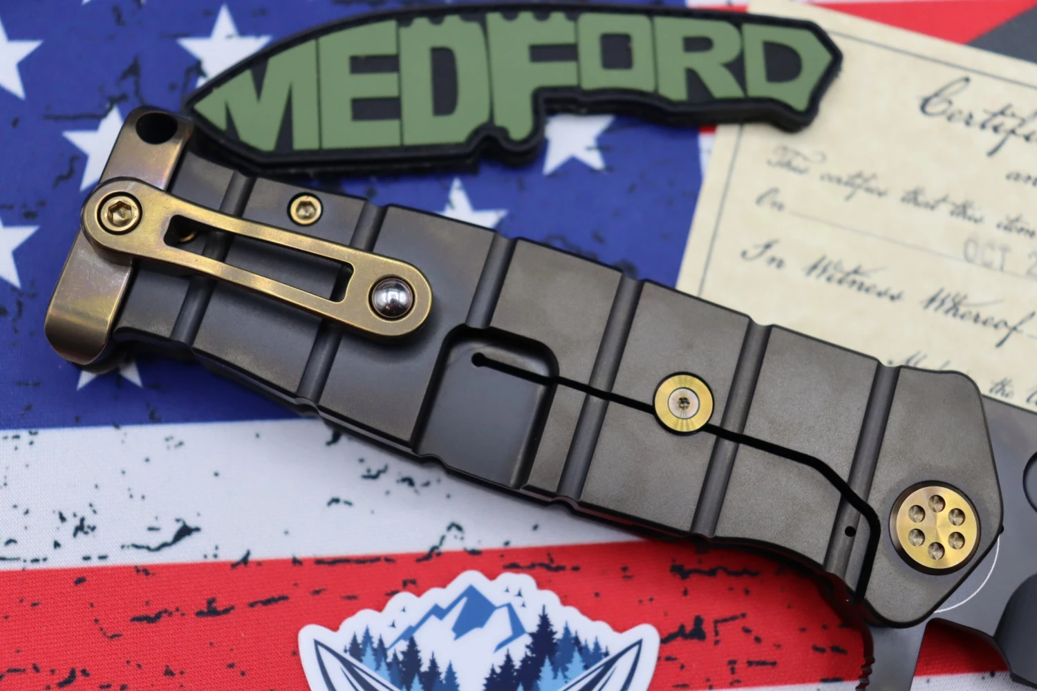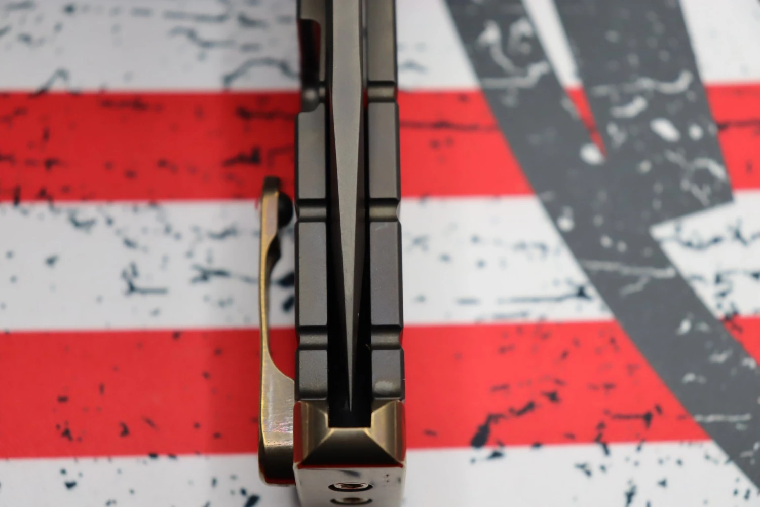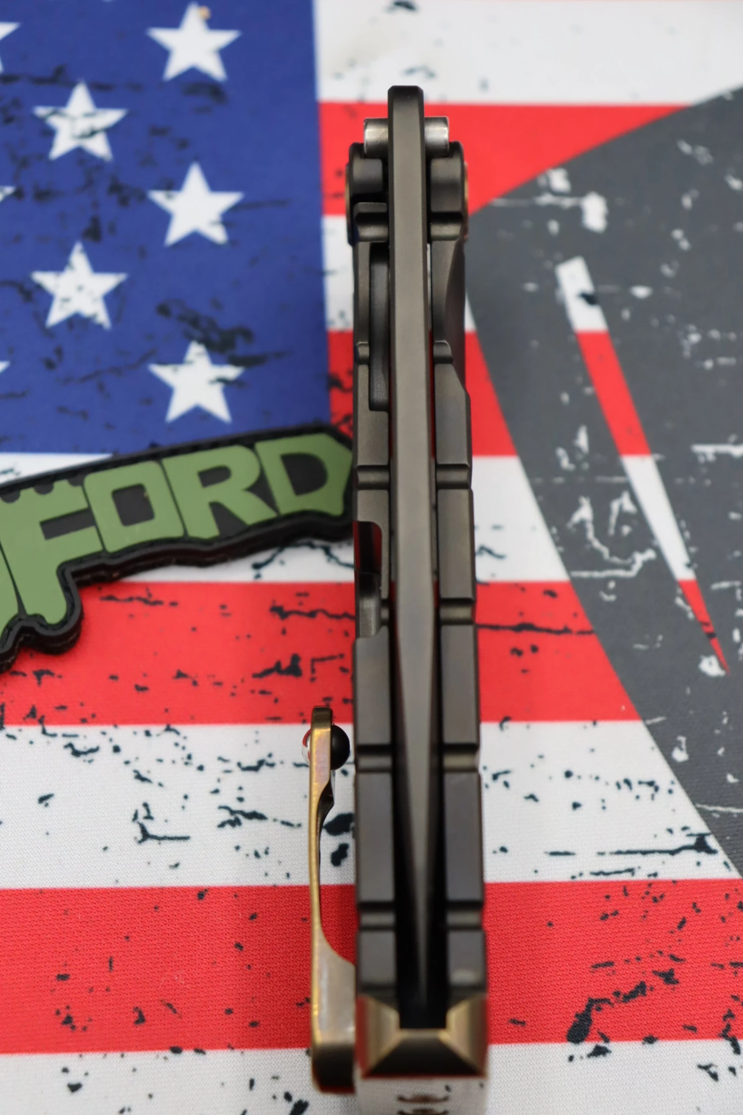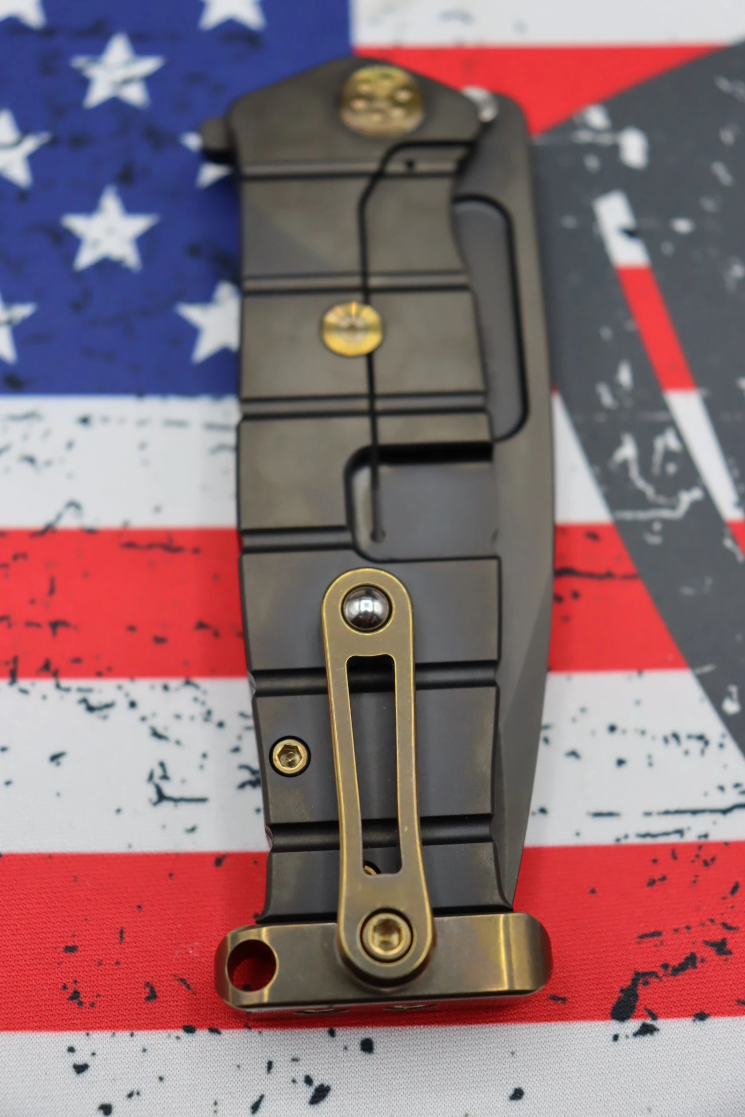 This knife features PVD titanium milled handles with bronze hardware, clip, and pommel. It has a hand ground CPM-S35VN PVD blade.