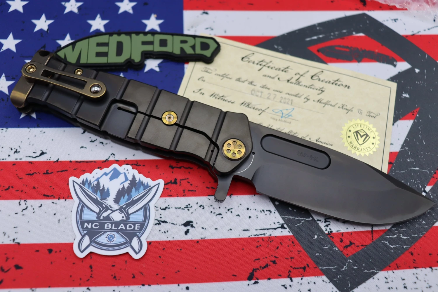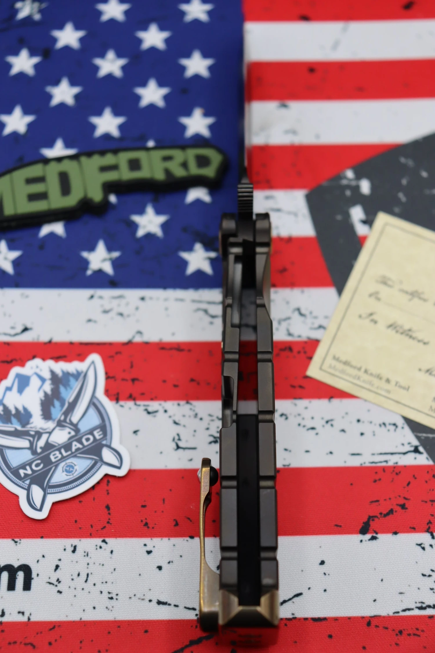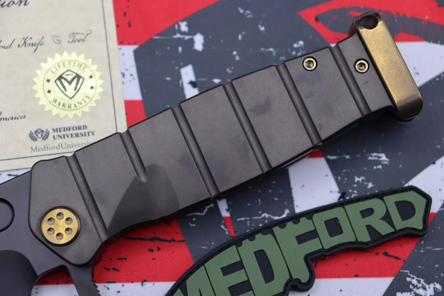 This knife features PVD titanium milled handles with bronze hardware, clip, and pommel. It has a hand ground CPM-S35VN PVD blade.