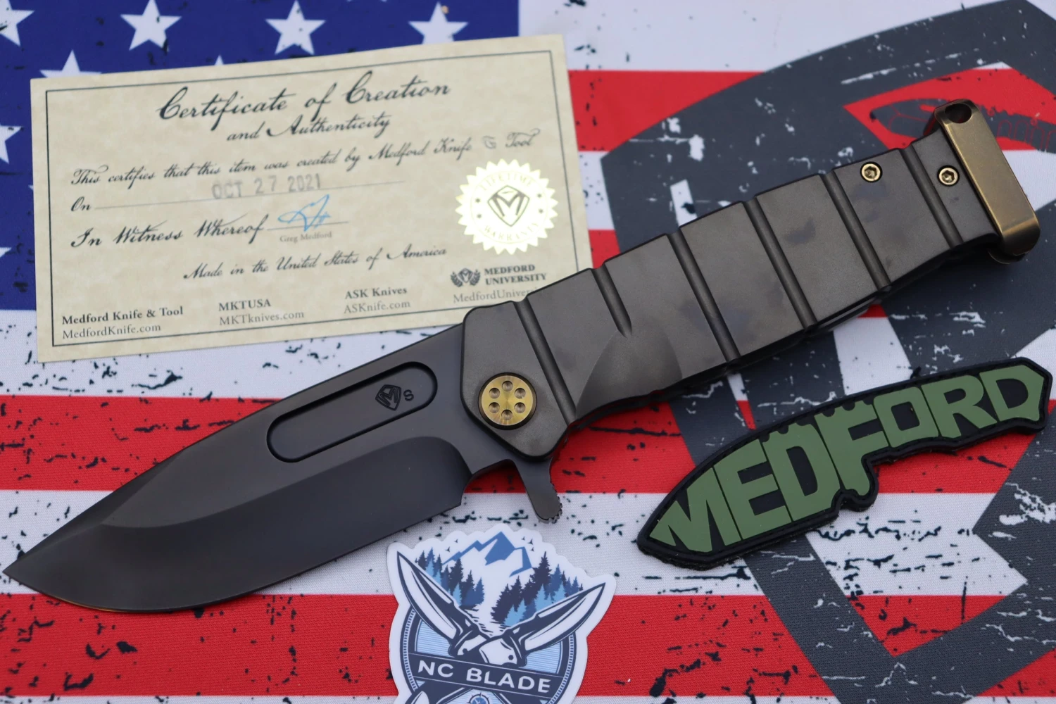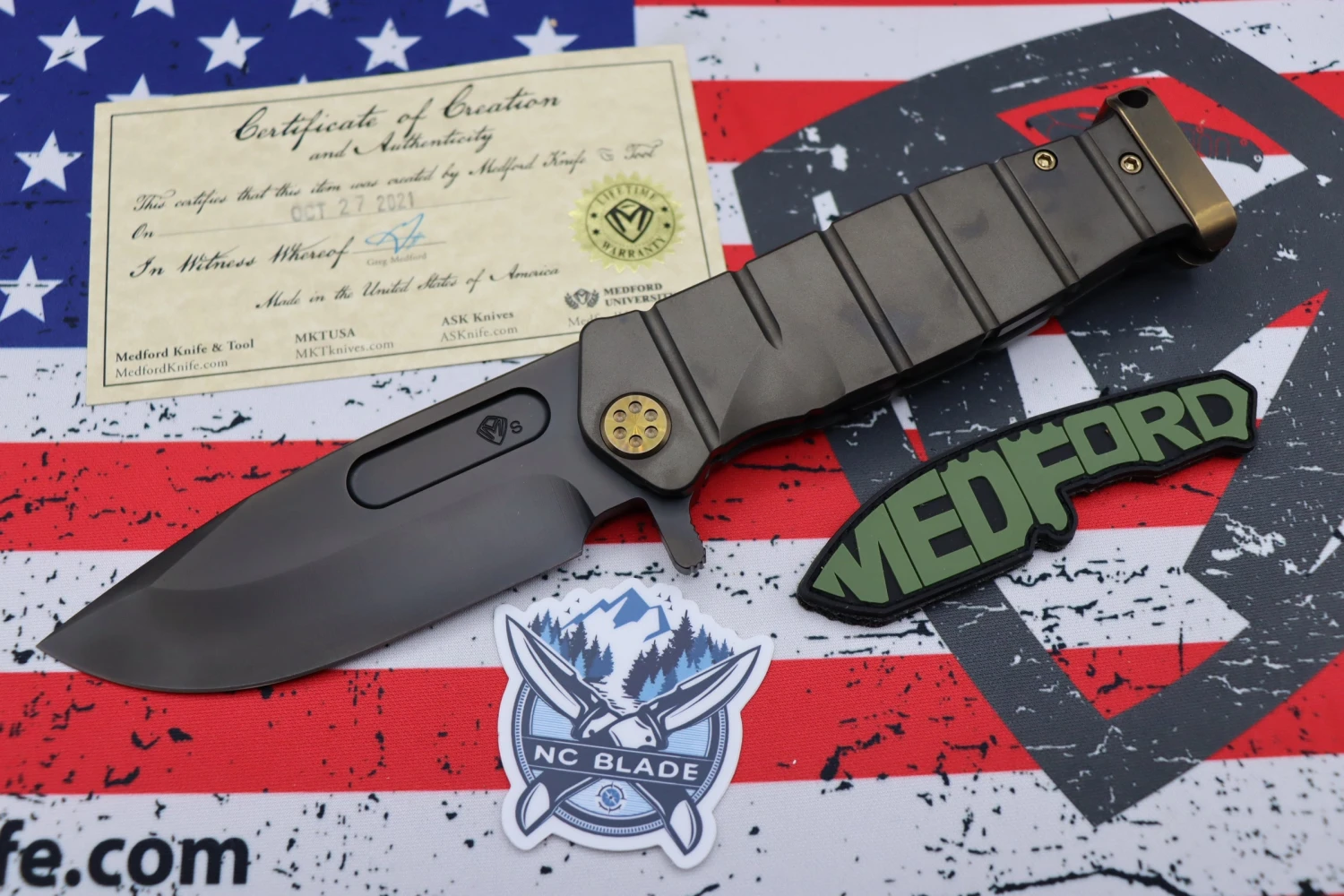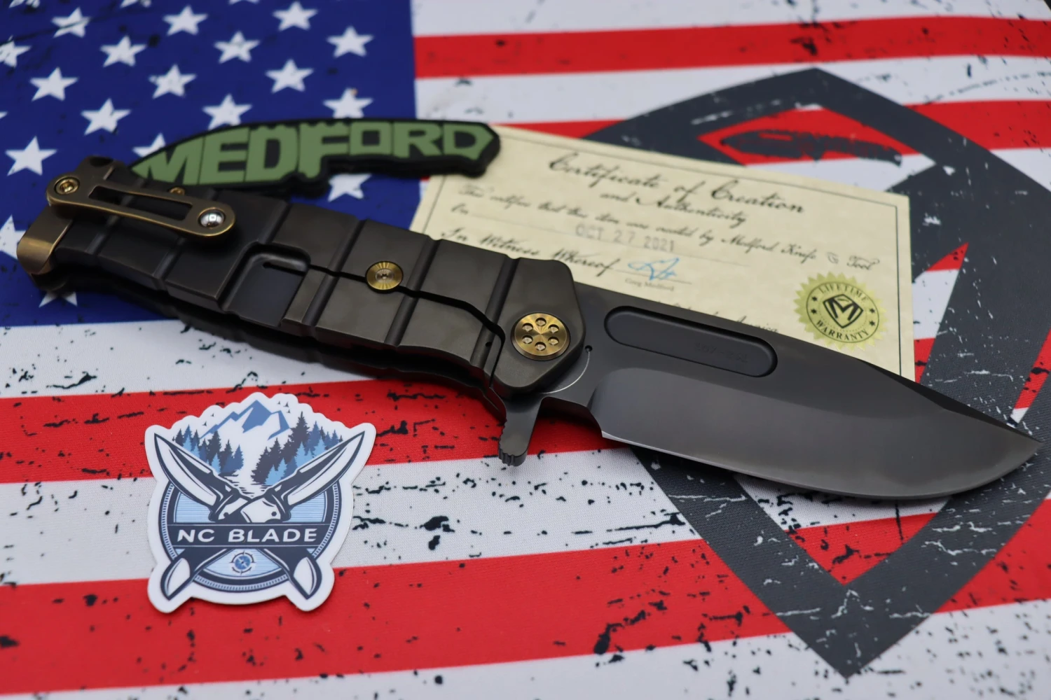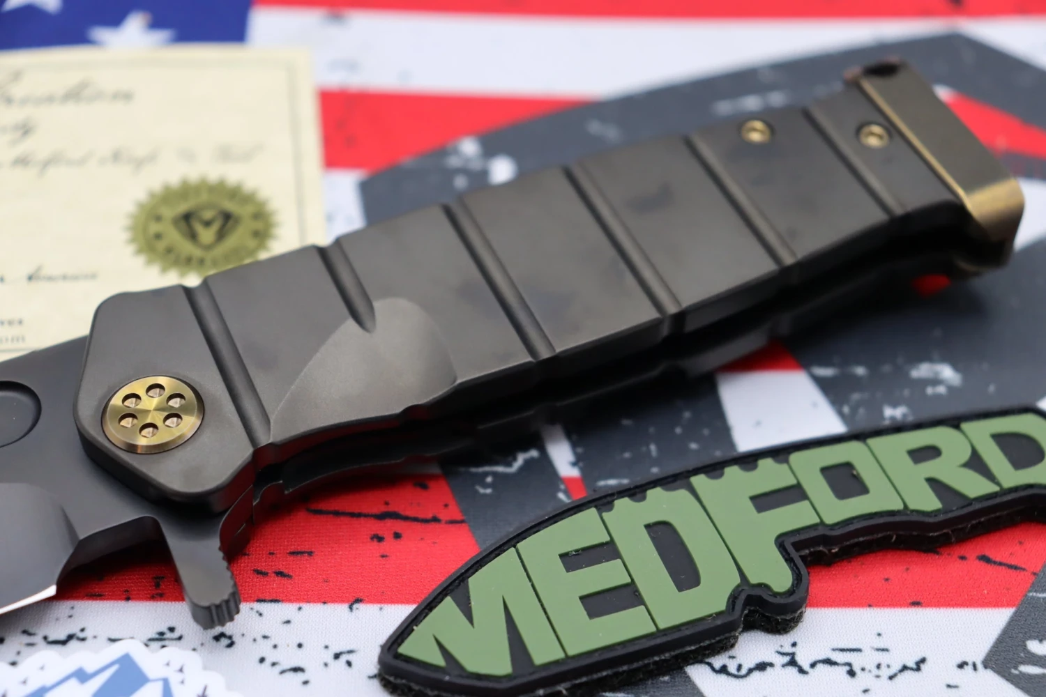 This knife features PVD titanium milled handles with bronze hardware, clip, and pommel. It has a hand ground CPM-S35VN PVD blade.