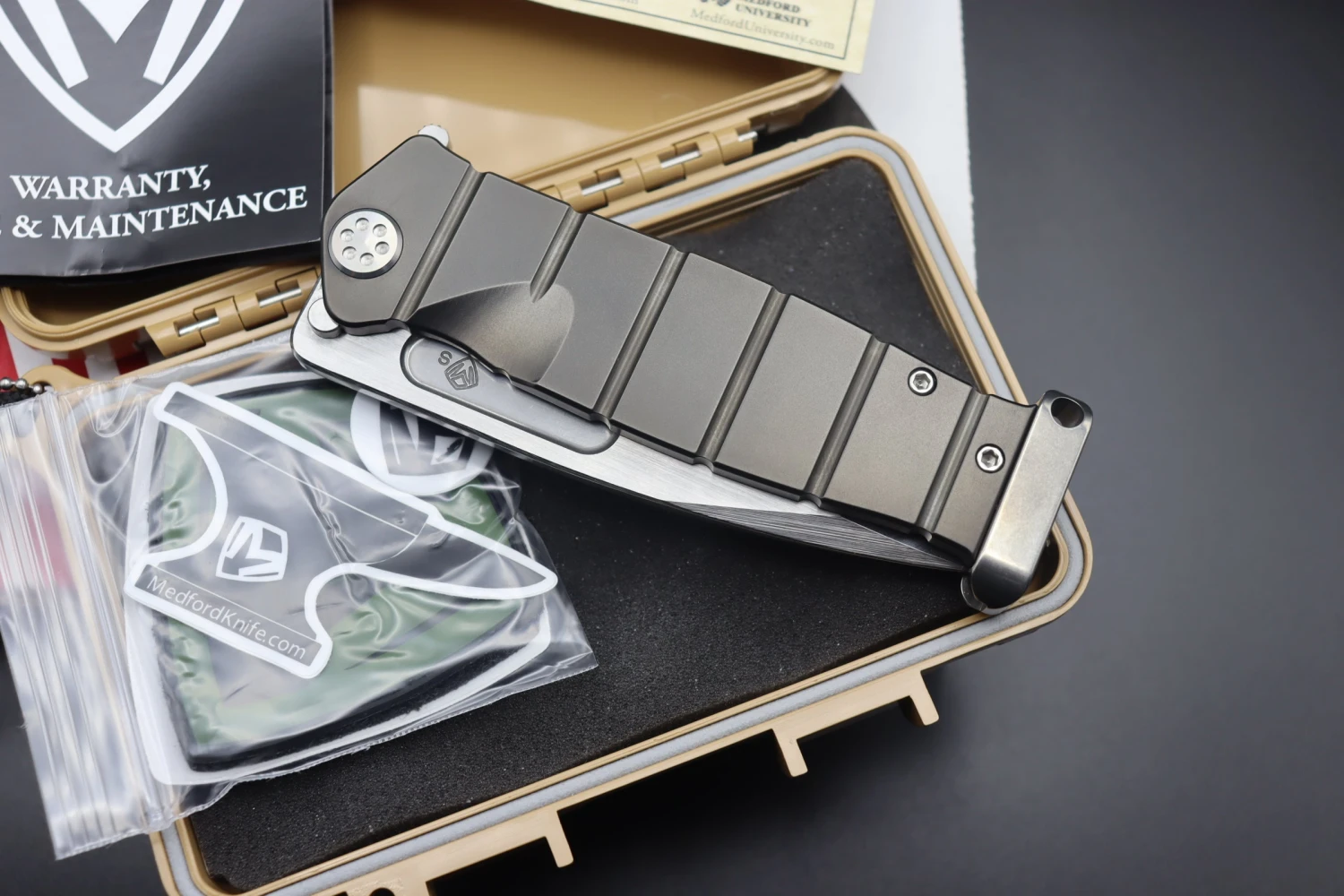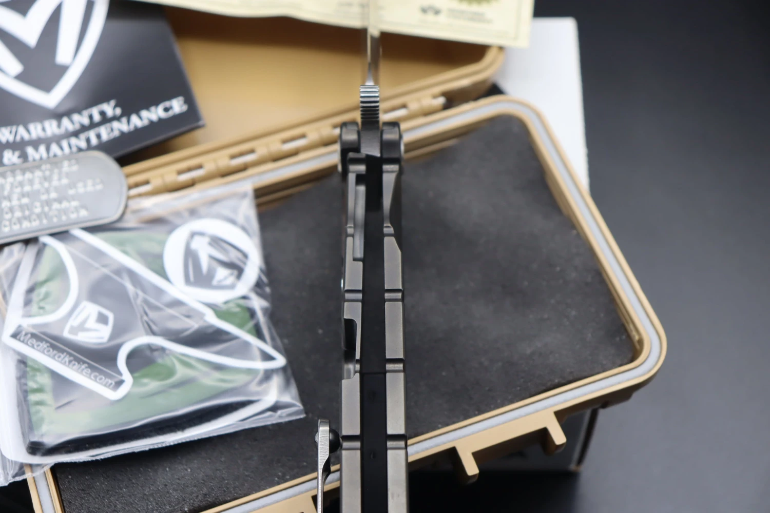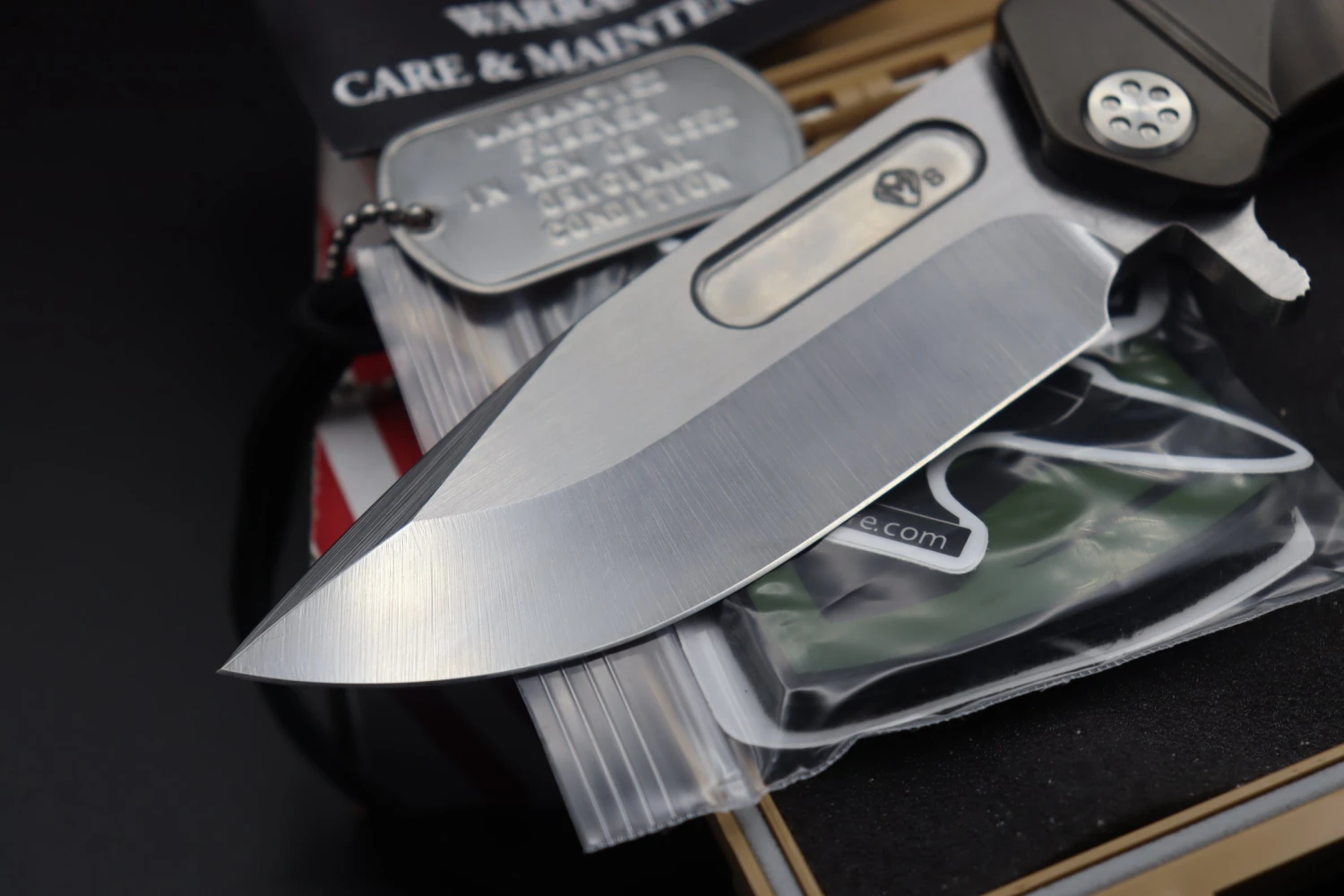 We believe we’ve come up with the best folding companion to the classic Marine Utility knife on the planet. The knife is a perfect companion piece to the fixed “Fighter” and we call it the “The Fighter Flipper.” This is a unique mix of Titanium components with the very best blade of S35VN heat treated to HRC 58. This a big manly knife that’s as comfortable working, as it is cruising around town in your pocket. There is so much going on with this knife its hard to take in: from the retro milling on the handles, drop-point blade, integral pommel to the bearing pressed into the one-of-a-kind pocket clip. There truly is NOTHING like the The Fighter Flipper™ in the knife world. You will want to chop, stab and smash something with this beast in your hand so proceed with caution…