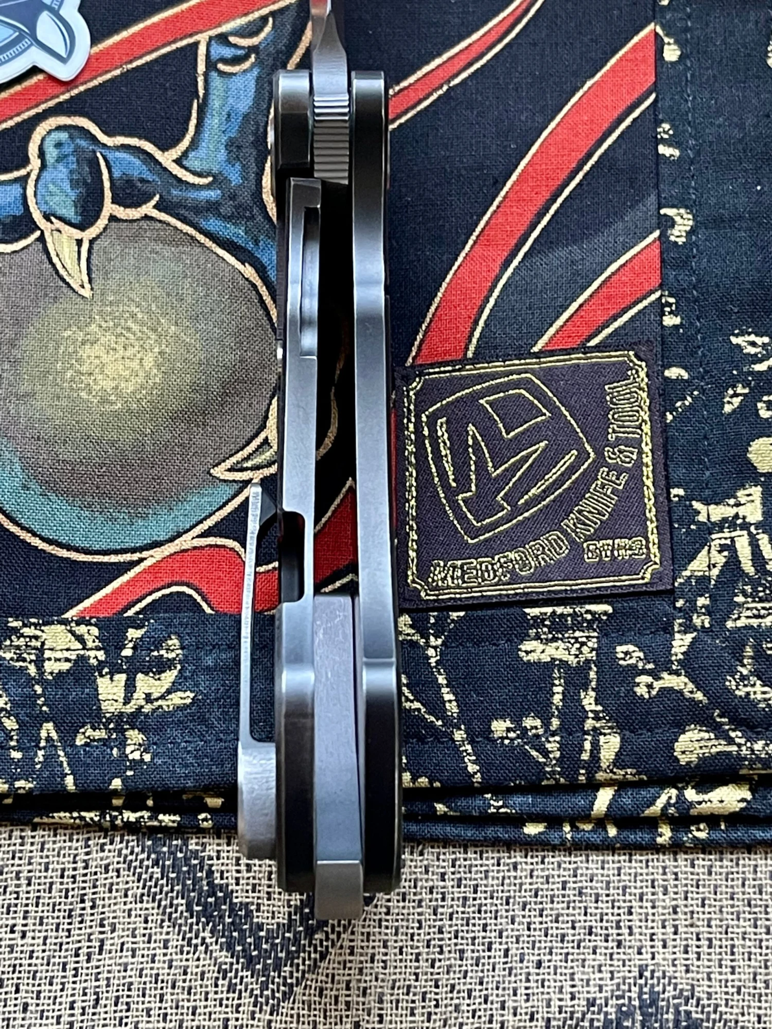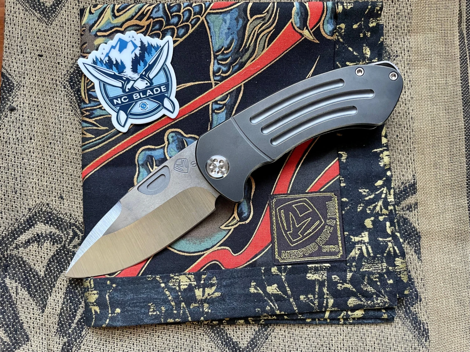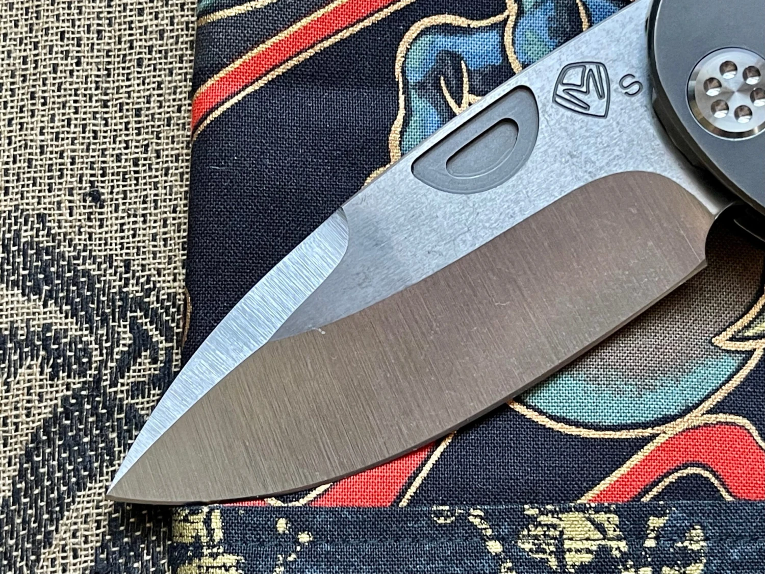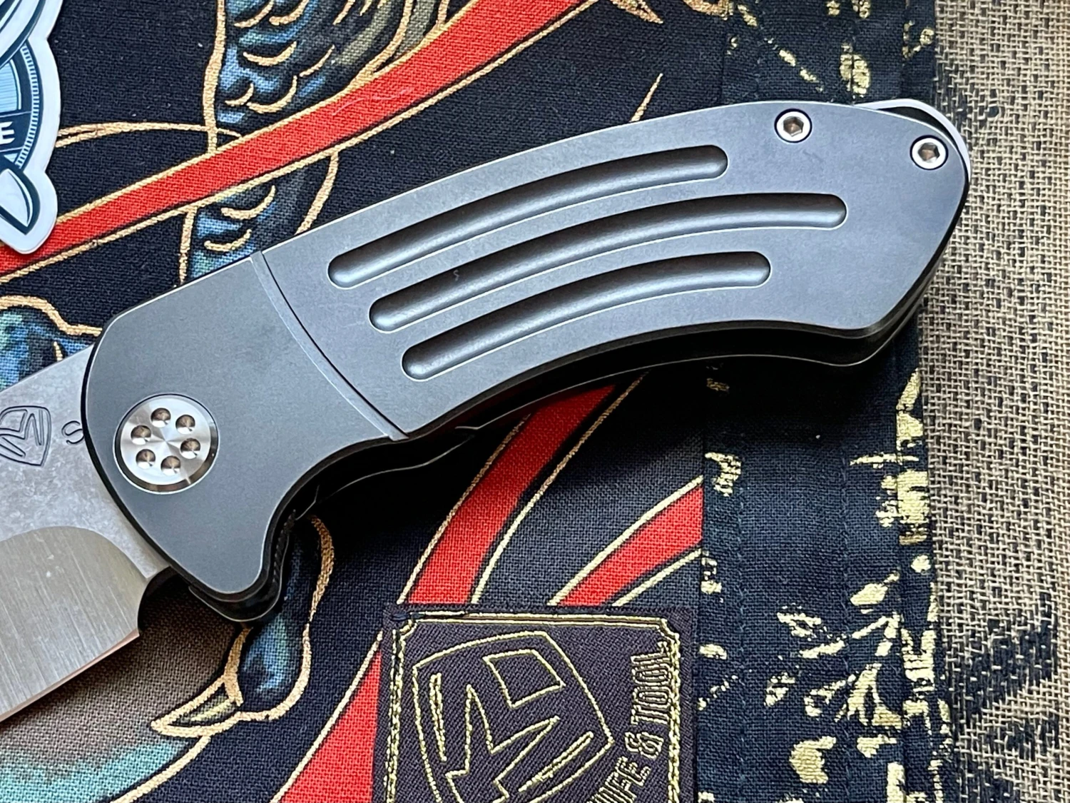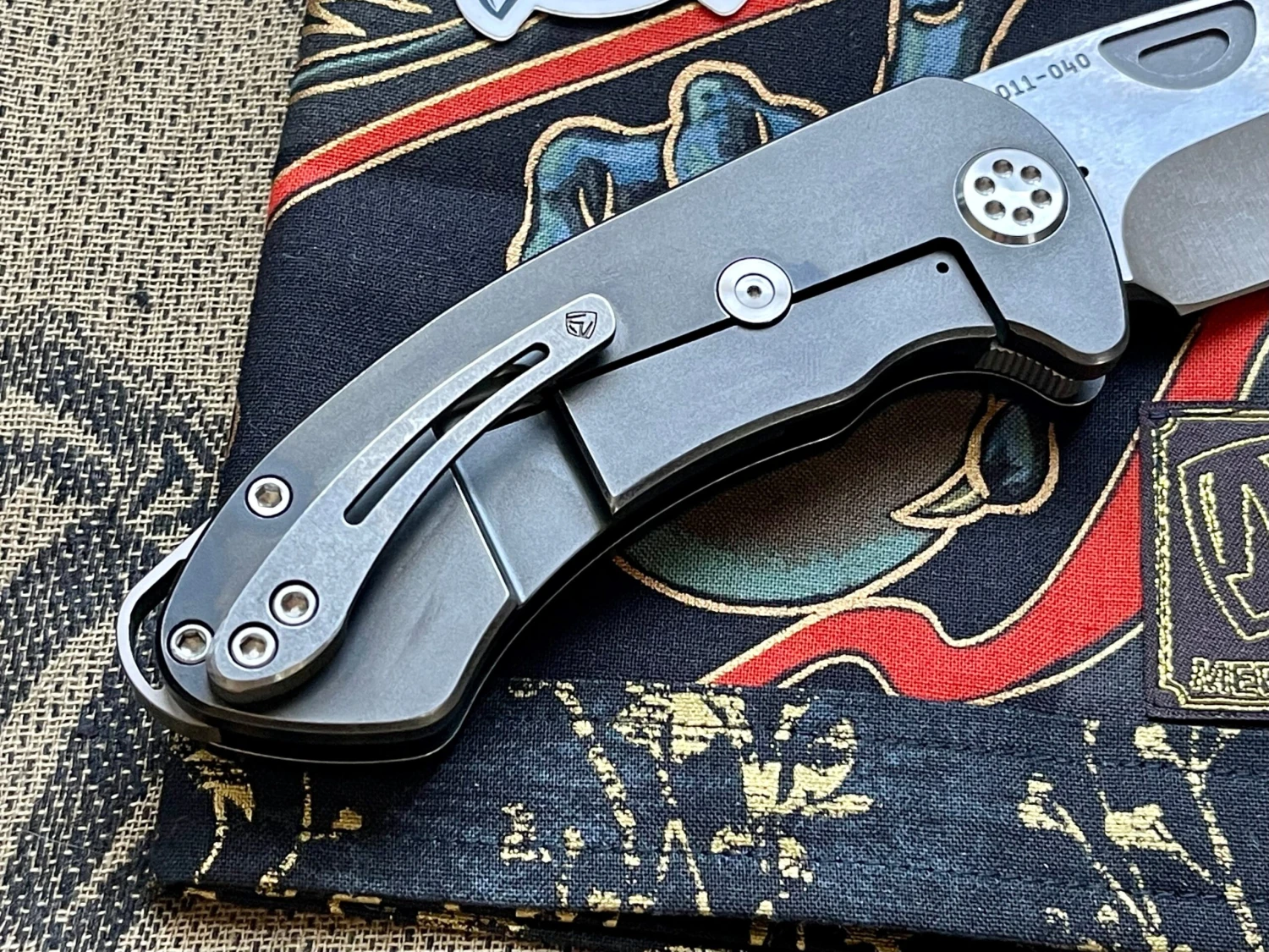 This item features a hand ground S35 blade with milled PVD coated titanium handles.