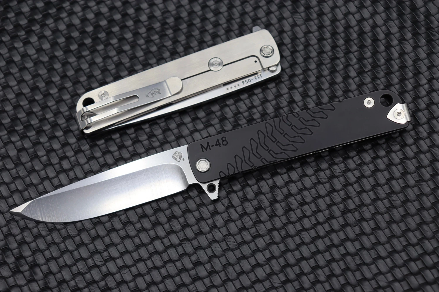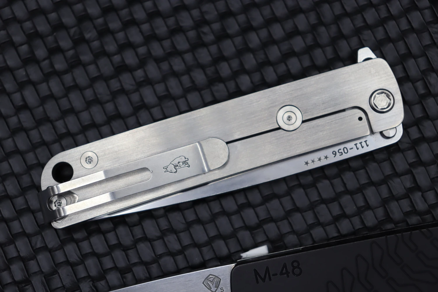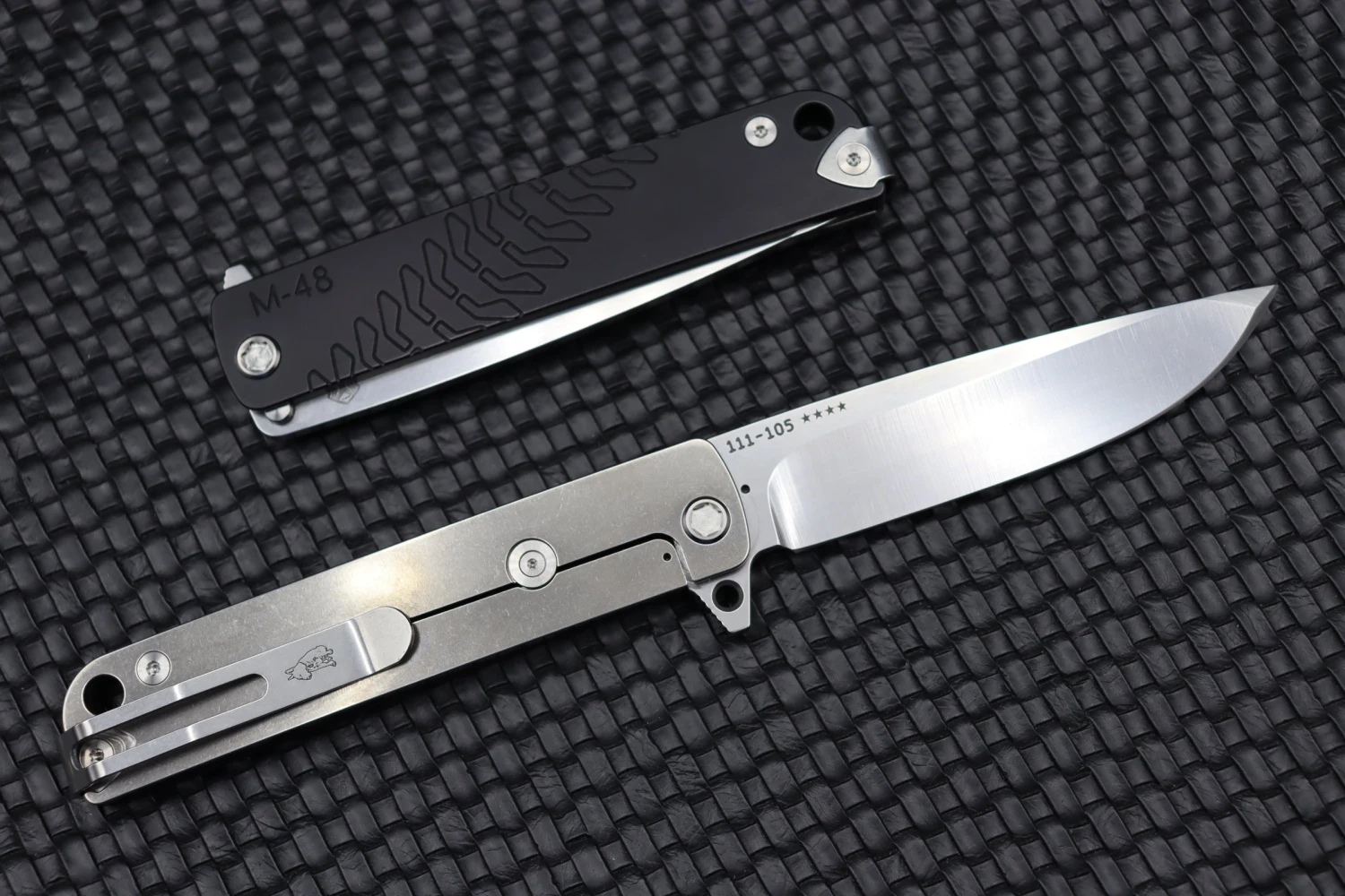 A homage to the M-48 Patton main battle tank and its four-man crew. 30 mph was never so exhilarating. A hybrid flipper on bearings with an Al handle, Ti spring and our newly introduced OTL and a reversible clip. At almost 9” fully deployed you have a very useful blade and with its hybrid construction, EDC friendly. With our new, innovative Magnus Edged™ tip, a hand-ground blade unlike any other. Lastly, fun “Easter Eggs” on the blade and clip.