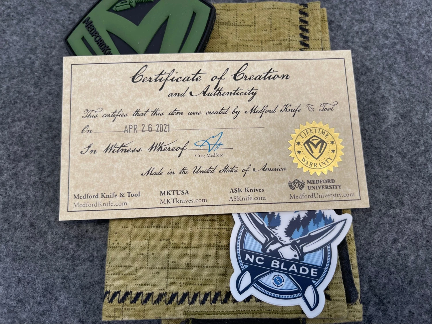 This knife features a tanto S35 blade with tumbled titanium bronze anodized scales.