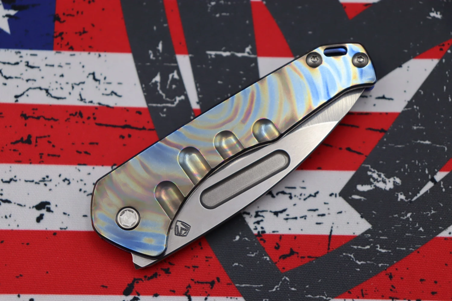 This knife has all the sexy appeal of the standard “Slim” but the action of an auto. The flipper-cam is yummy and well placed for comfort in both the open and closed positions. The blade rides on 18 bearings and has the most satisfying snap both open and closed action. Titanium, S35Vn and all American Made. The design speaks to Greg’s design evolution and our connection to the evolving sentiments within the knife community. Not everyone wants a large aggressive tactical folder but they may want the style and performance. This knife is for them…