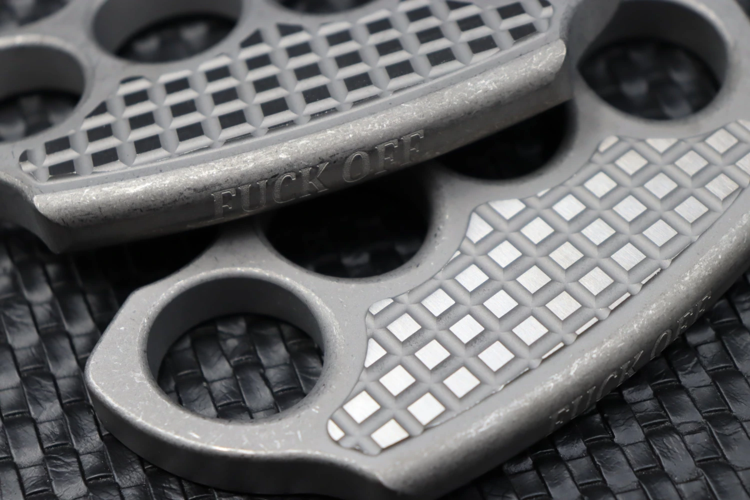 This is the awesome Hand Tank from Microtech Knives! It is made from Titanium and features an apocalyptic finish with satin frag milling on the flats and a friendly F OFF laser engraved bottom.Â