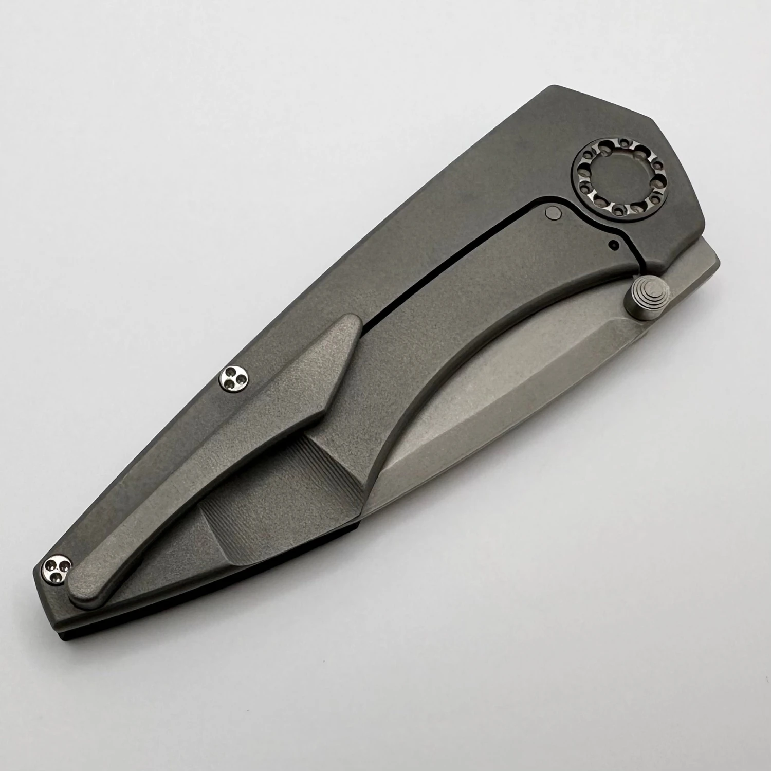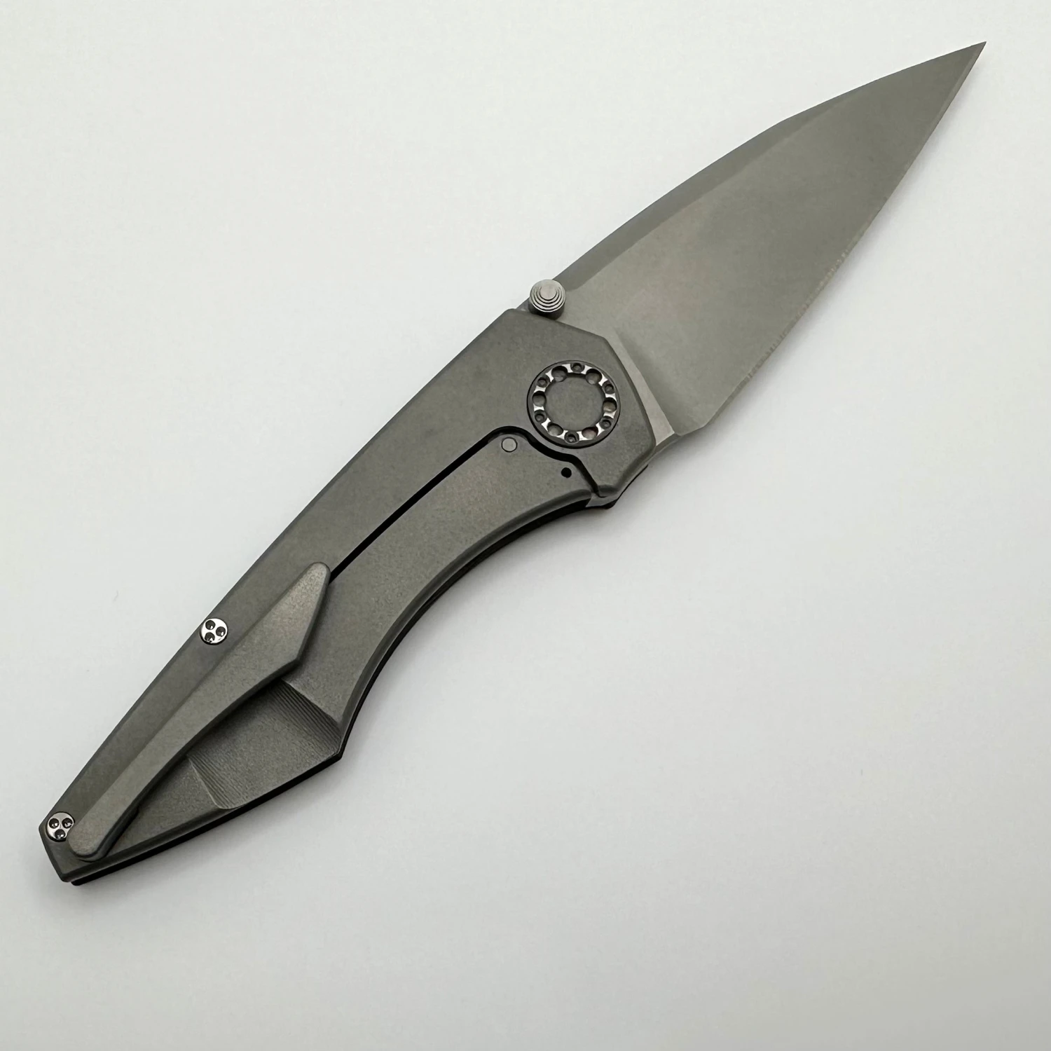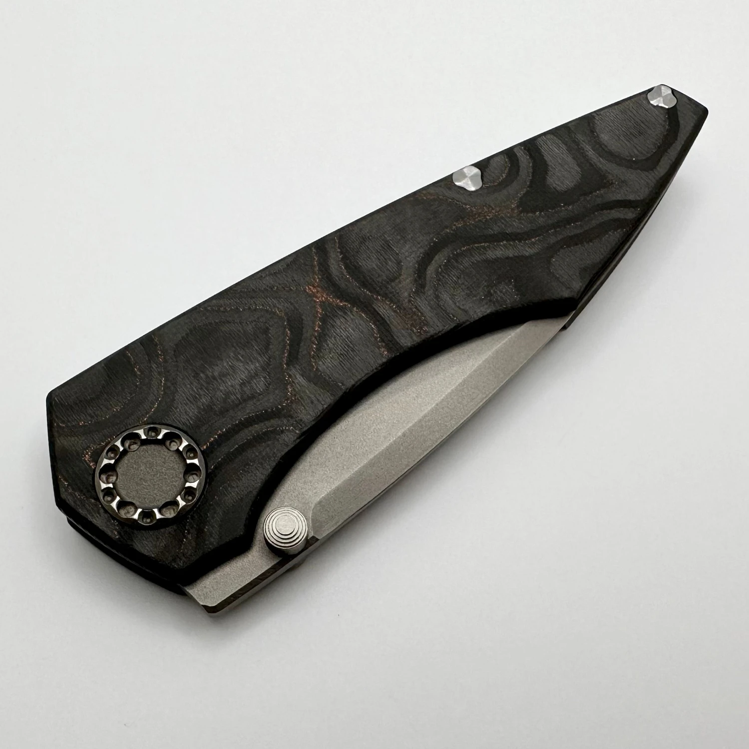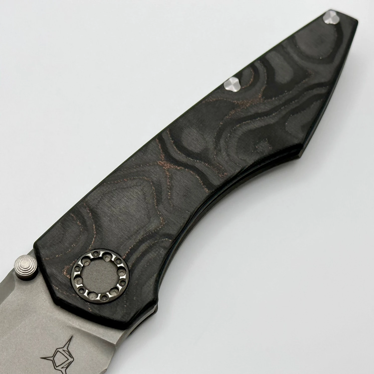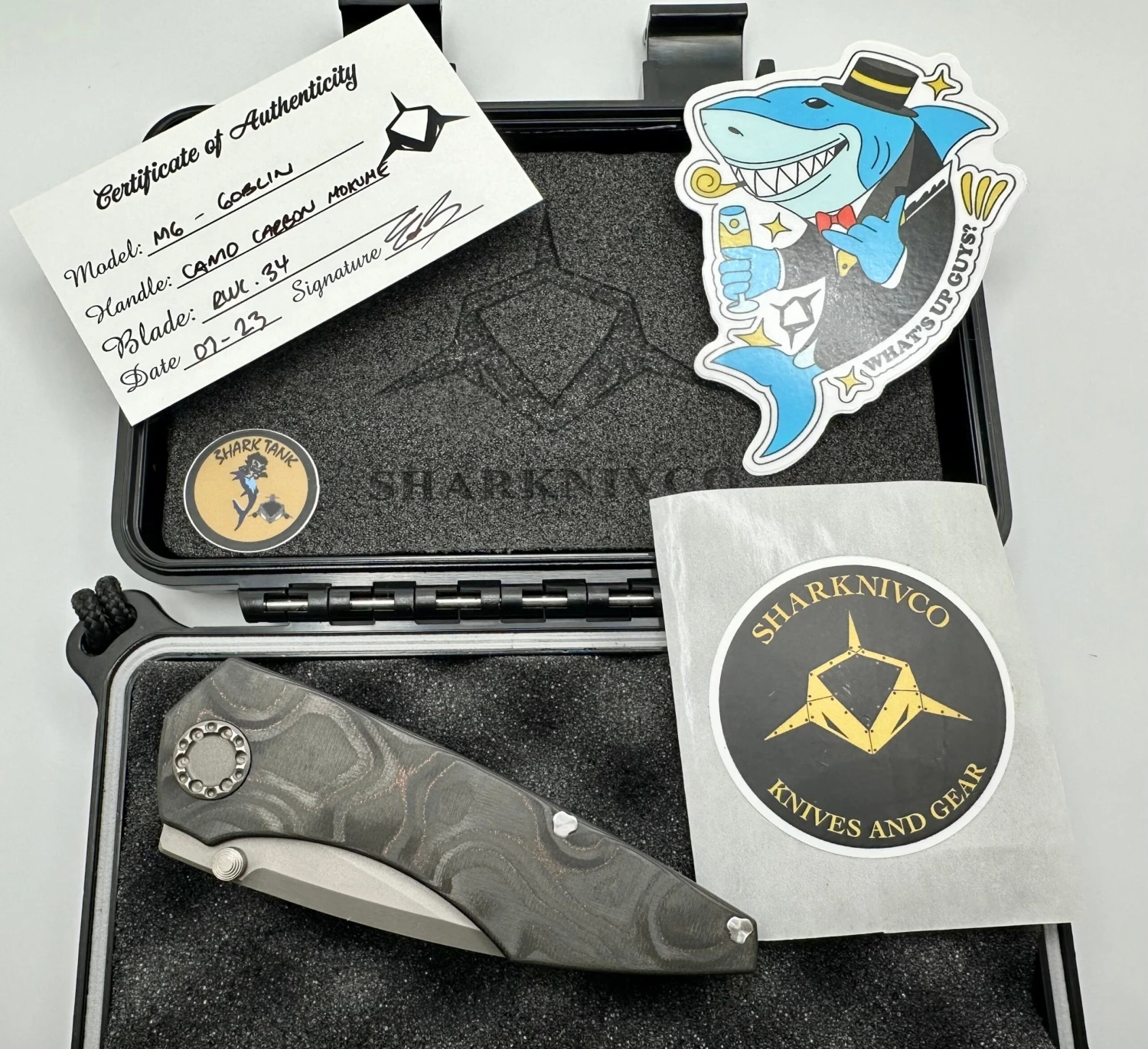 This is a beautiful mini goblinĀ folder with aĀ mokume camo carbon show scaleĀ and a bead blast RWL34 blade. It comes with the hard case, COA, and stickers.