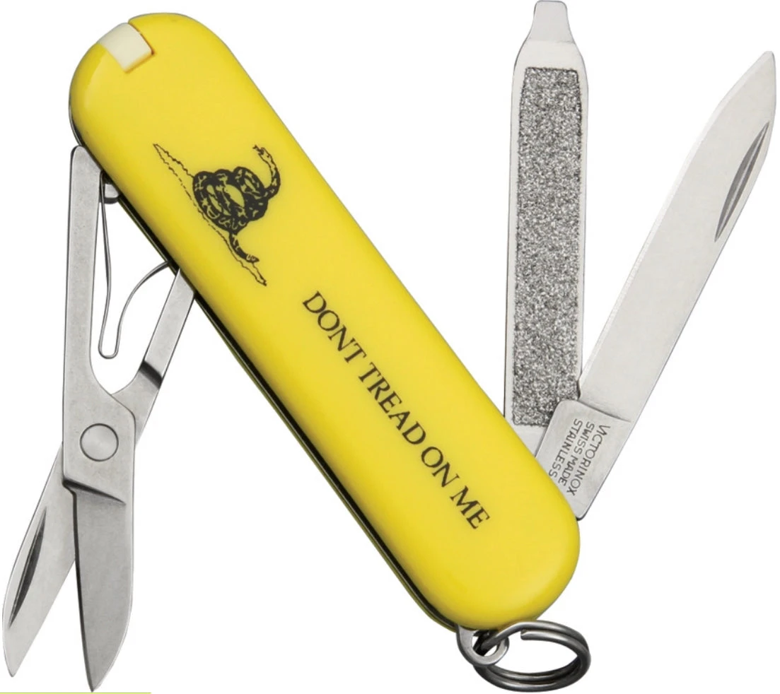 2.25″ closed. Yellow ABS handle. Tools include: Small blade l File l Screwdriver tip l Scissors l Keyring l Tweezers l Toothpick. Gadsden Flag – Don’t Tread On Me artwork.